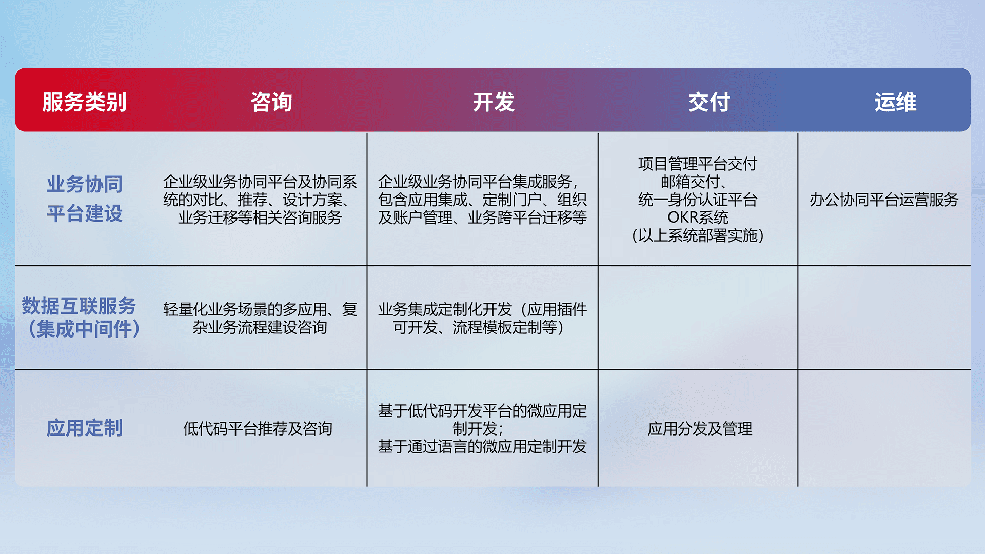 针对钉钉、、、、企微、、IDaas等平台级产品提供产品的规划、、、、方案、、交付、、、定制化开发等服务,,实现如统一协同办公、、、、智能客户服务、、混合会议管理、、智能数据查询、、等业务场景,,实现数字化转型。。。。