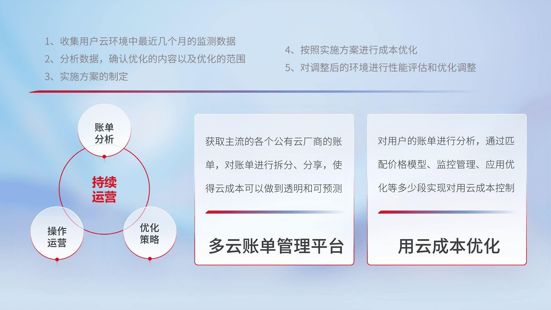 通过多云纳管,,以统一的资源数据模型把客户的云资源进行抽象和封装,,,进而实现对多云资源的统一操作,,保障云资源管理的可靠性、、稳定性与可用性。。量身定制化运维内容,,配置、、、、开发运维、、补丁管理、、、、备份、、、监控、、、、认证和访问管理、、、审计和日常巡检等,,,保障在用云过程中的可靠度,,,稳定度以及高可用率。。。